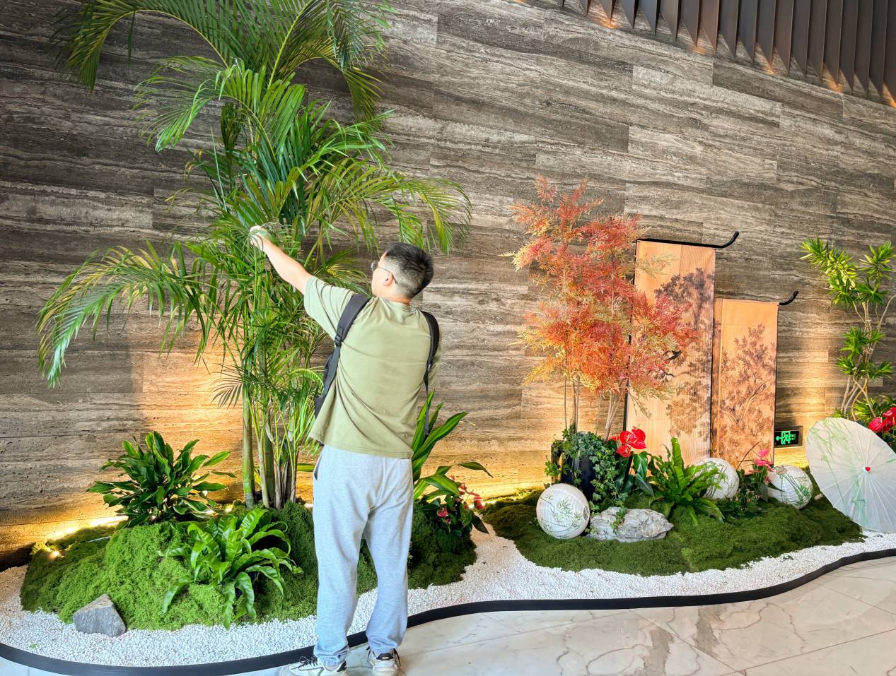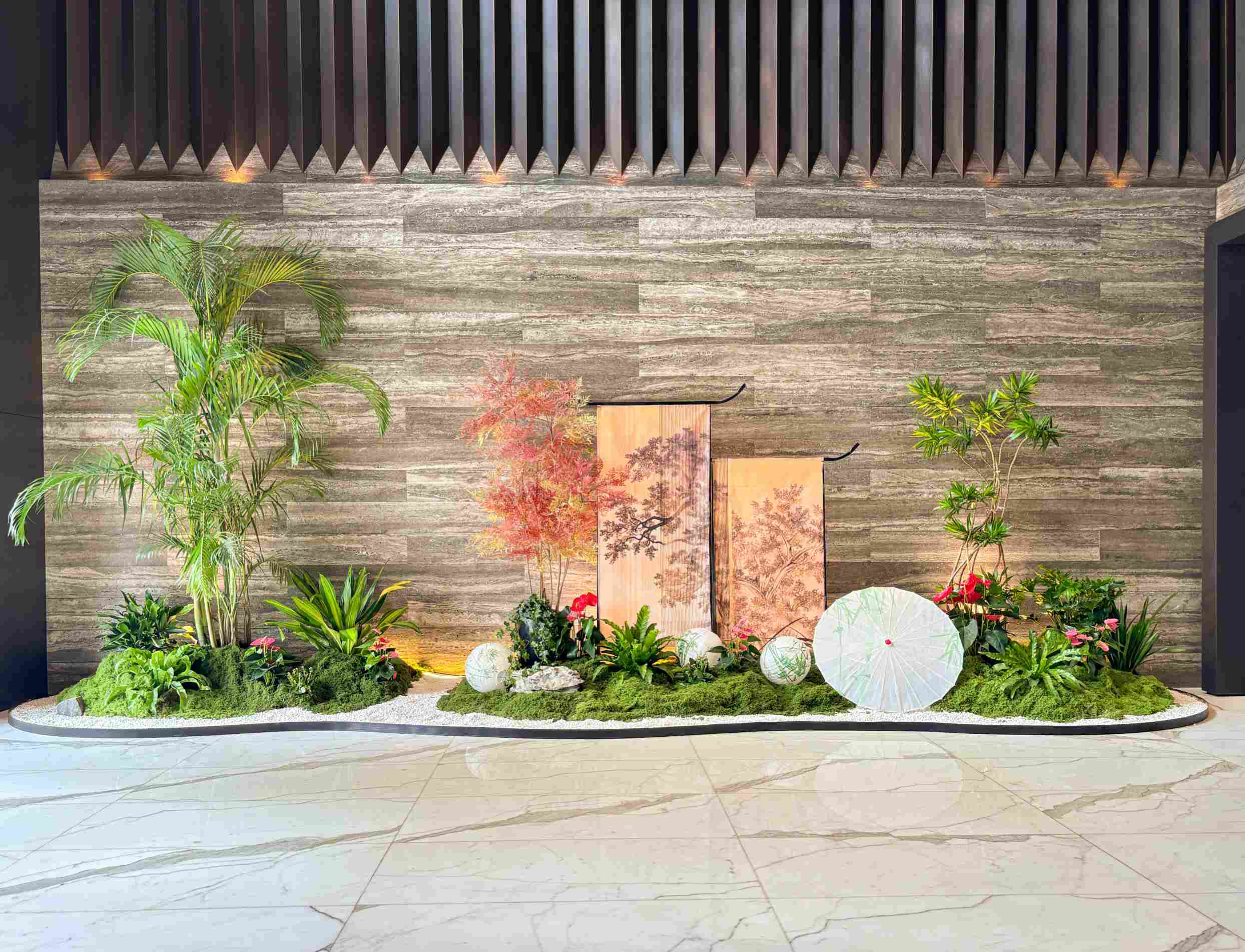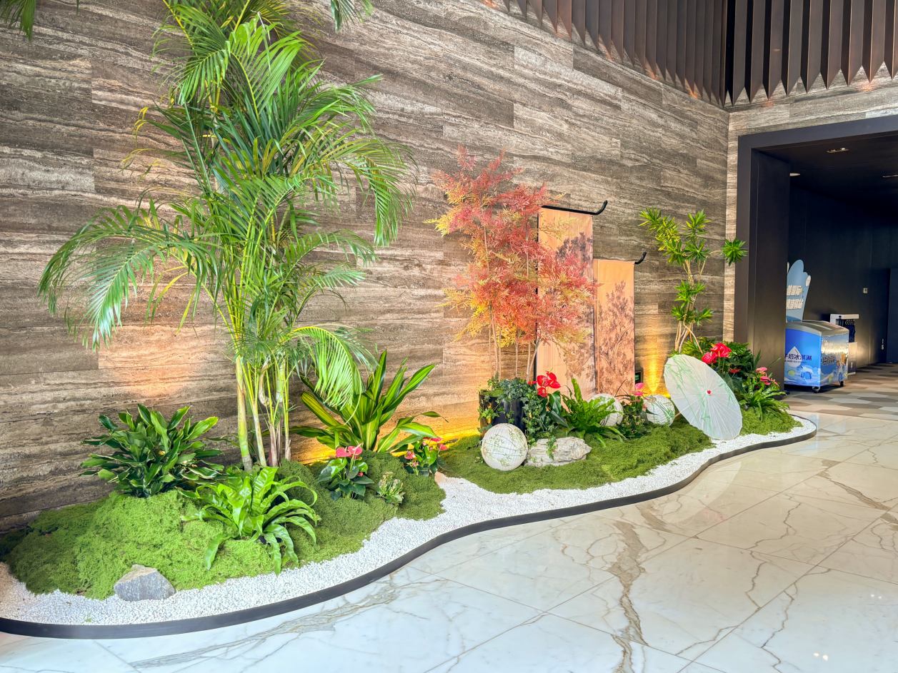 深綠的散尾葵與斑斕的南天竹錯落有致,搭配水墨屏
