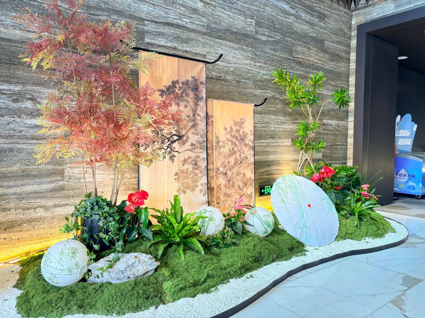 散落在苔蘚上的紙燈籠與油紙傘,把趣味悄悄藏進辦